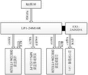 LP1-24M16R型PLC用來(lái)處理控制系統(tǒng)的邏輯部分,采用公司的專用梯形圖視窗,可以根據(jù)用戶的需求方便及時(shí)的增加減和修改功能。模擬量拓展EX-2AD2DA型PLC模塊輸出一定的電壓控制變頻的頻率從而控制切刀電機(jī)的運(yùn)行。